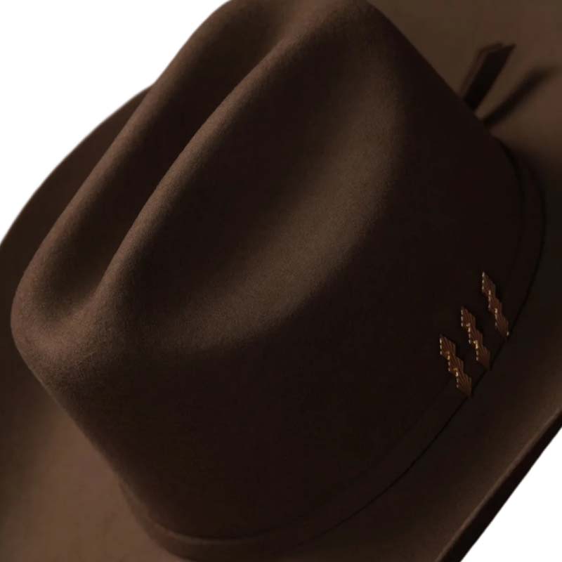 Design and communicate the details of this cowboy hat, including its color, style, and logo placement.