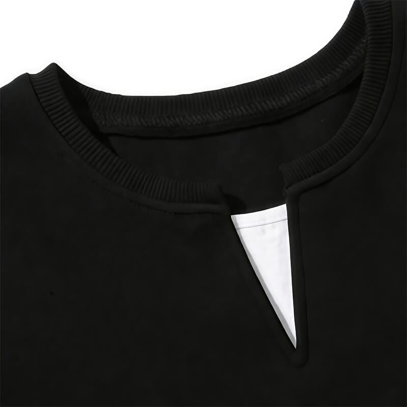 Communicate and design the details of the V-neck short sweatshirt, including color, style, and logo position.